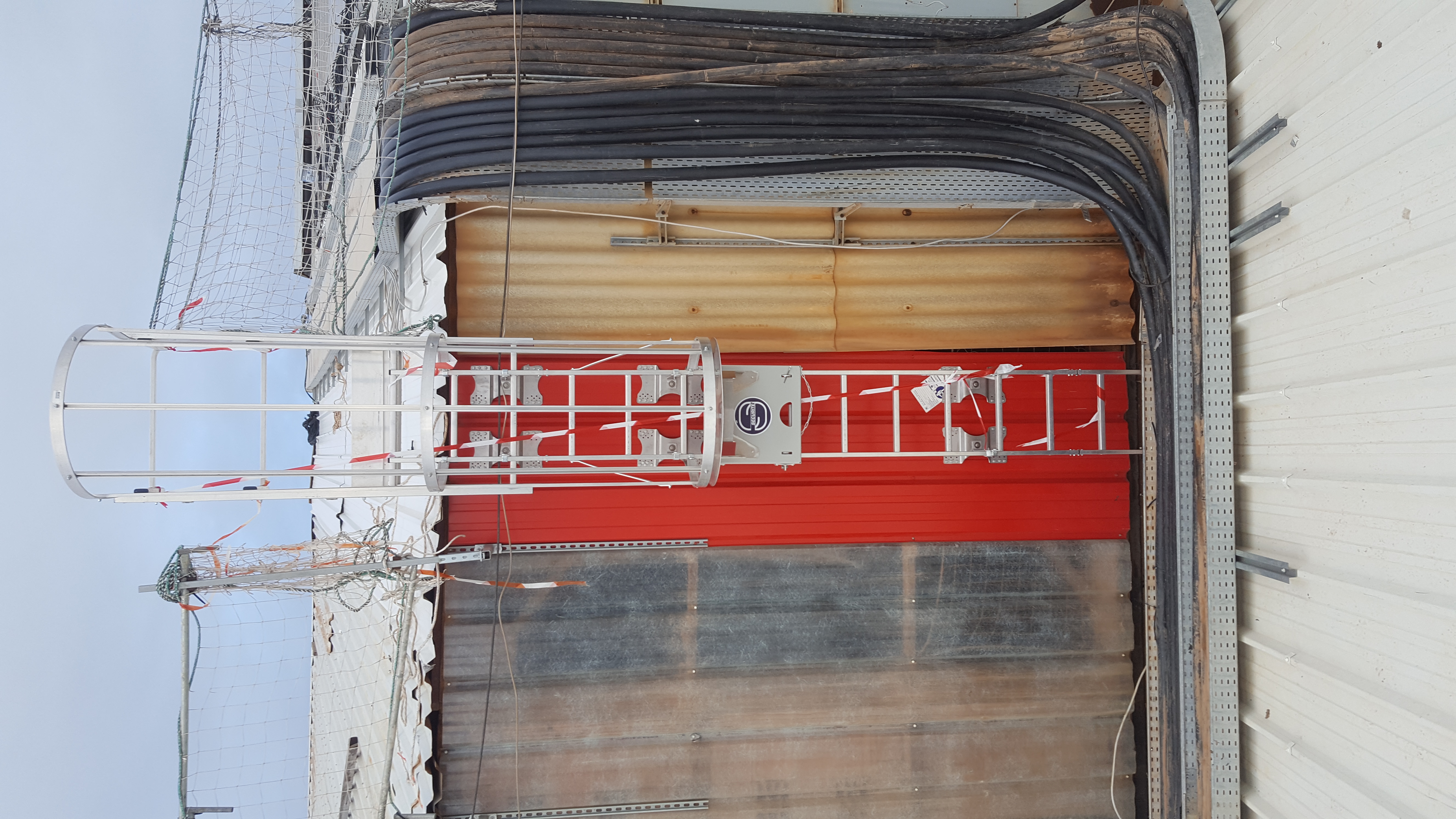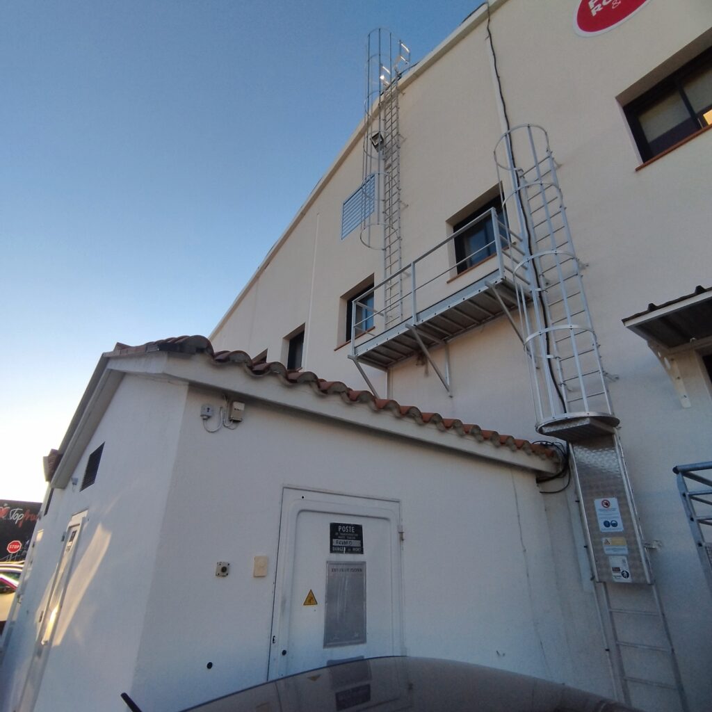 Fourniture et pose d’échelles fixes avec crinoline, assurant un accès sécurisé aux toitures et aux zones techniques en hauteur. Les échelles sont implantées conformément aux prescriptions réglementaires, avec dispositifs de départ, de repos et de protection adaptés. - Filets antichute
