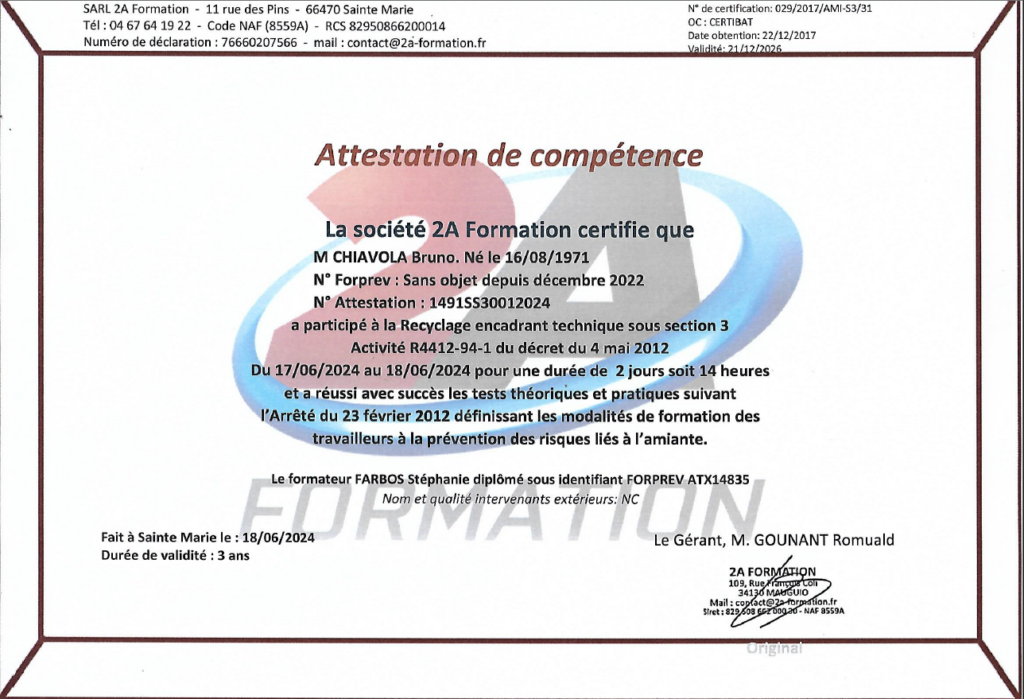 L’ensemble des démarches est formalisé afin d’assurer une traçabilité complète et le respect des exigences réglementaires en vigueur relatives à l’amiante.